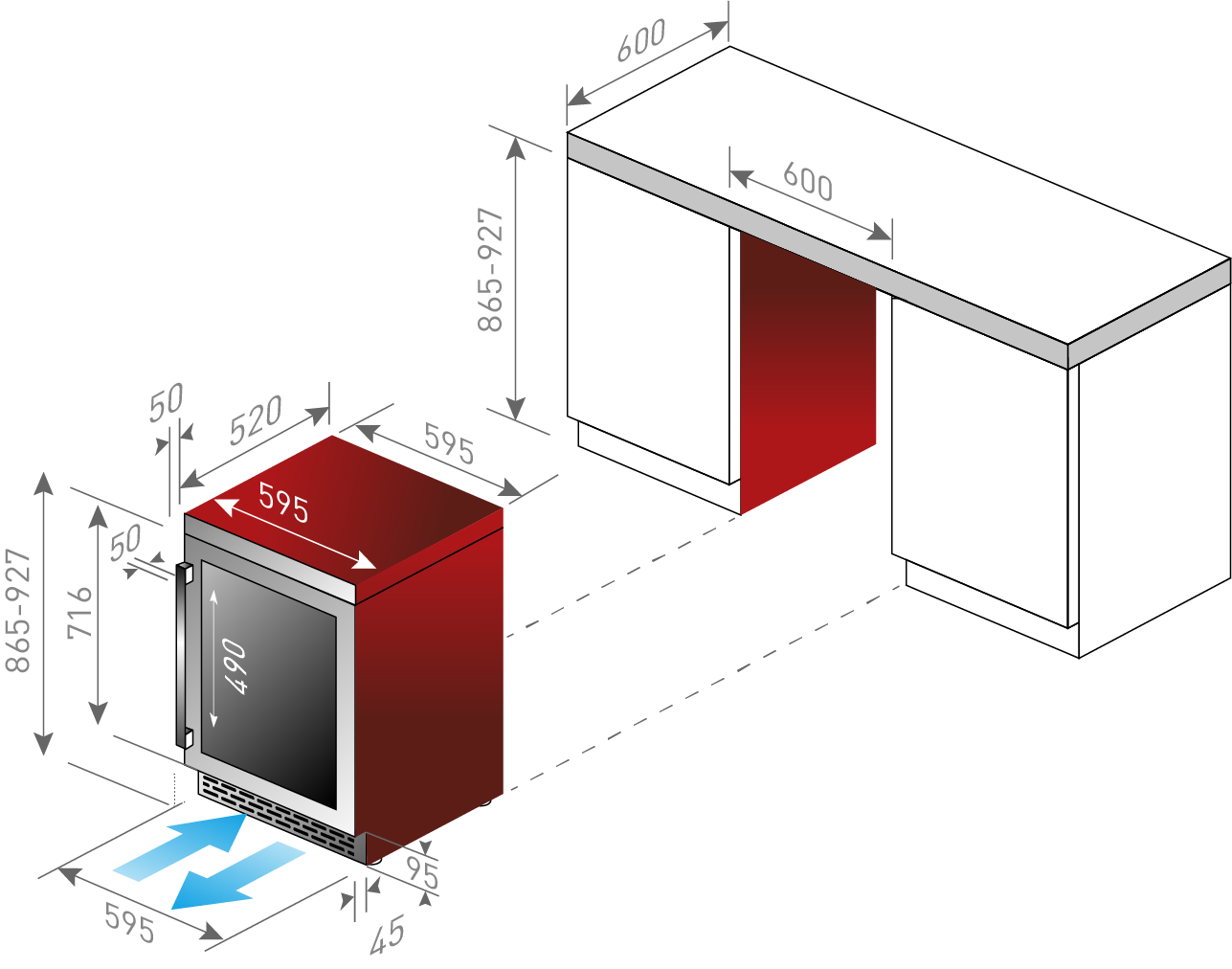 • 88 cm onder werkblad: minimale hoogte onder het werkblad voor een keukendeur met een hoogte van 78 cm.